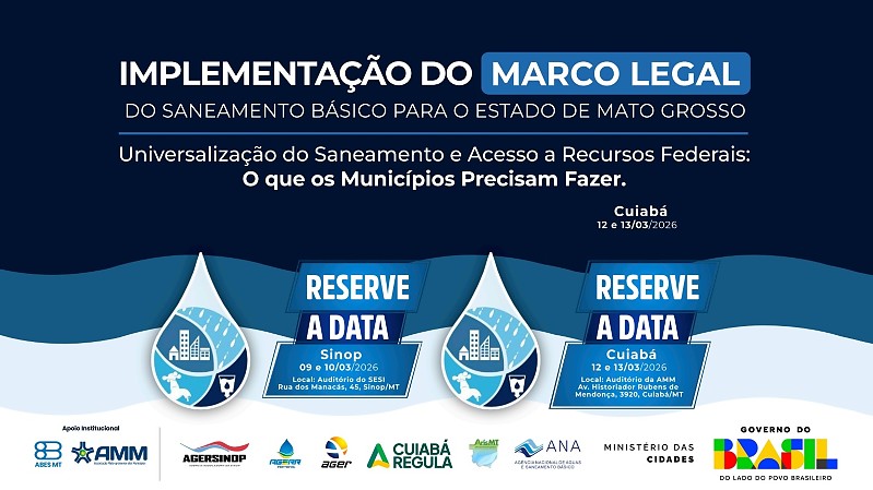 O evento será realizado pela Agência Nacional de Águas e Saneamento Básico (ANA), Ministério das Cidades, Agências Reguladoras Municipais de Mato Grosso, com o apoio institucional da AMM.