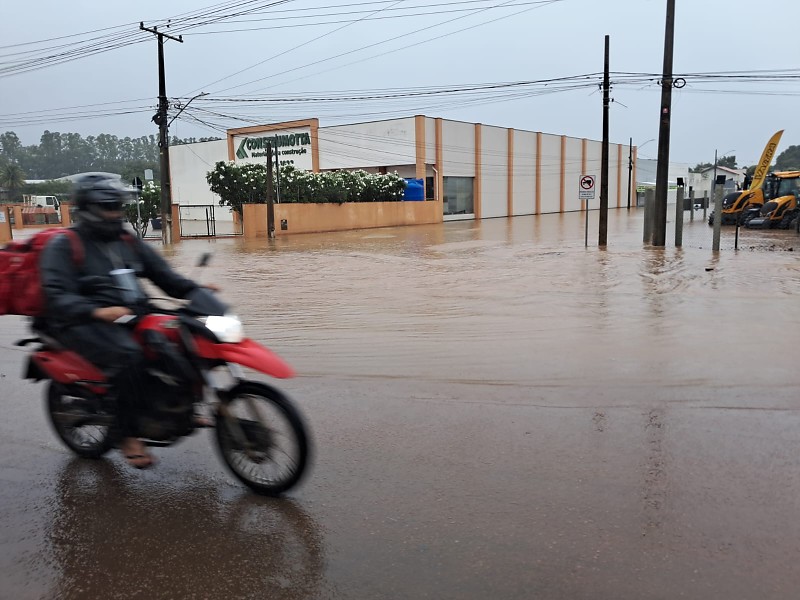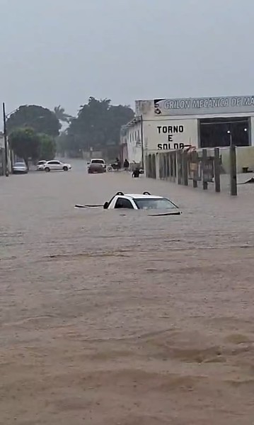 Um veículo que trafegava pela rua no momento da enxurrada ficou praticamente submerso, evidenciando a gravidade do cenário.