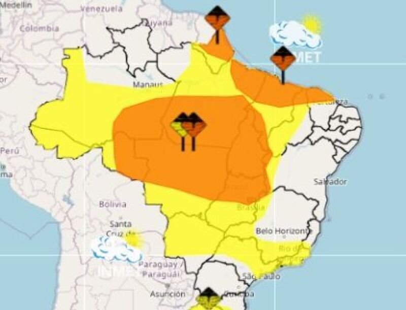O final de semana será chuvoso e com calorão na Baixada Cuiabana. A região está na área de cobertura de dois alertas de perigo para chuvas intensas do Instituto Nacional de Meteorologia (Inmet). O alerta amarelo de perigo potencial engloba as 142 cidades de Mato Grosso e tem validade até a noite desta sexta-feira (6). Já o alerta laranja, mais severo, segue até 23h deste sábado (6) e cobre 94 municípios do Nordeste, Norte, Centro-Sul, Sudeste e Sudoeste Mato-grossense.