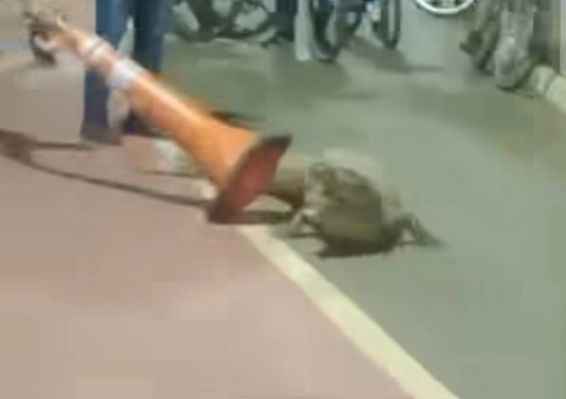 Porém, desta vez, o jacaré tentou se defender e quando o homem o pressionou com o cone, 'Celso' virou a cabeça e abriu a boca, como que se preparasse para revidar.