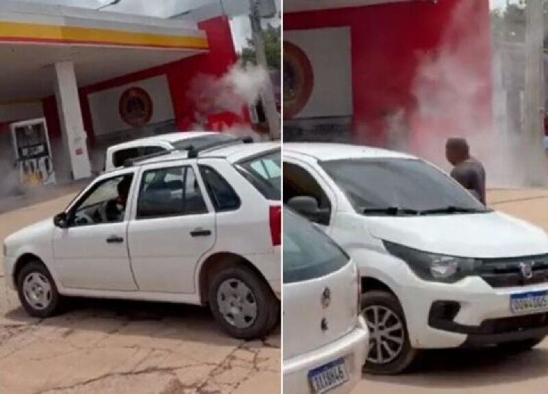 Um flagrante do momento mostra a correria que se formou no posto. Dois funcionários, munidos com extintor de incêndio, apagaram as chamas e a fumaça do equipamento se espalhou pelos posto assustando os clientes.