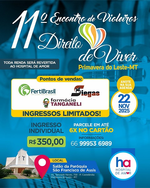 O 11º Encontro de Violeiros Direito de Viver, realizado em Primavera do Leste (MT), pelo engenheiro agrônomo André Lodo, foi confirmado. Desde 2015, o evento arrecada fundos para o Hospital do Amor, referência mundial no oferecimento gratuito de tratamento de câncer. Neste ano, o encontro será no dia 22 de novembro, no Salão da Paróquia São Francisco de Assis e deve reunir cerca de 600 pessoas, além de violeiros do Mato Grosso, São Paulo, Goiás, Mato Grosso do Sul e de outros Estados.