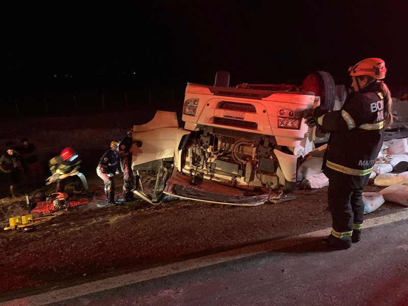 A ocorrência foi registrada às 1h48, no km 255 da BR-070, sentido Barra do Garças. De acordo com informações da 6ª Companhia Independente Bombeiro Militar (6ª CIBM), a guarnição foi acionada via 192 para atendimento a um capotamento de carreta carregada com farinha de trigo.