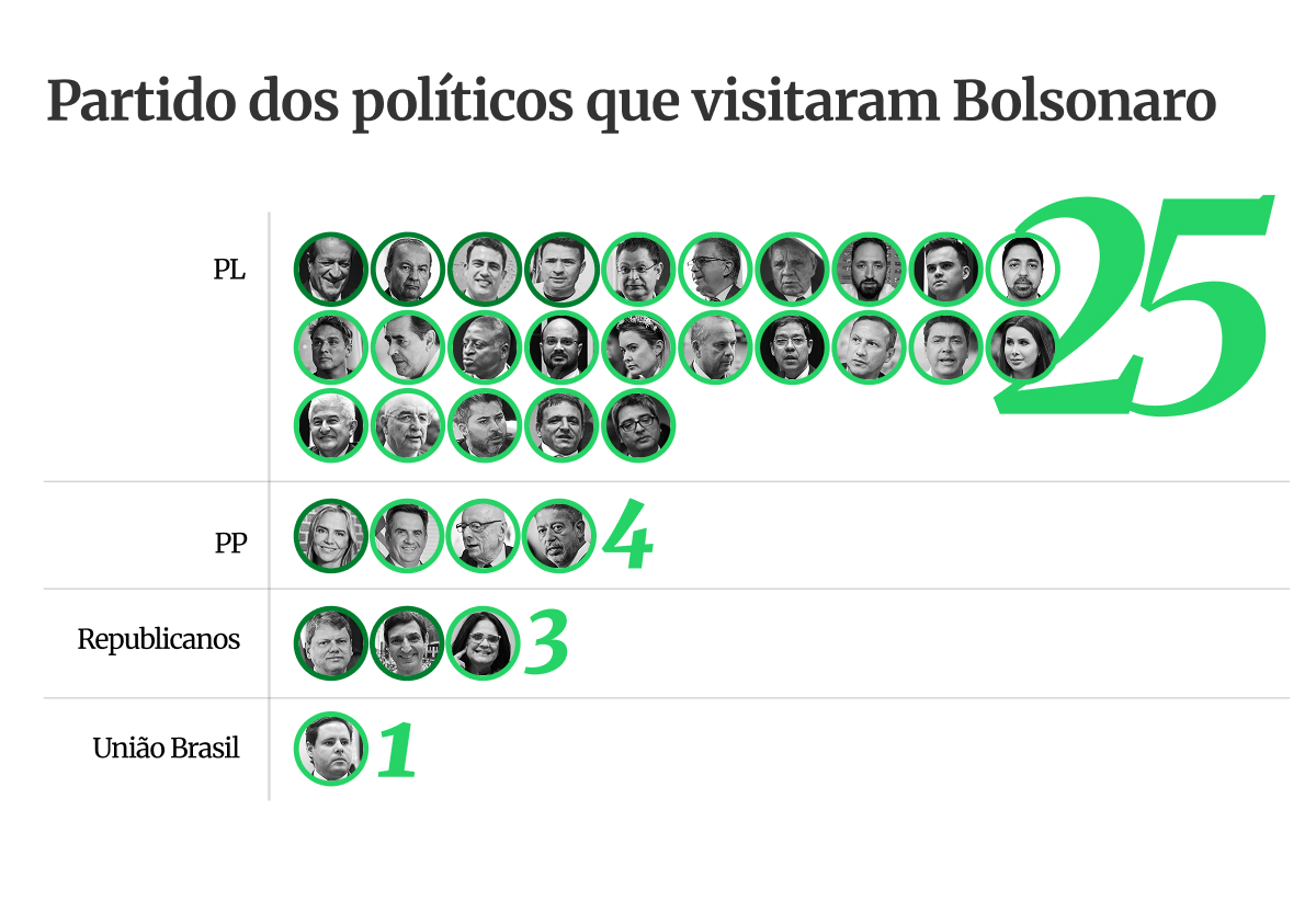 Dos 33 visitantes ligados à política, 26 são congressistas — em sua maioria deputados e senadores do PL. Entre eles estão o deputado Sóstenes Cavalcante (PL-RJ), líder do partido na Câmara, e o senador Rogério Marinho (PL-RN), líder da oposição no Senado. O presidente do PL, Valdemar Costa Neto, esteve na residência em duas ocasiões: 25 de setembro e 20 de outubro.
