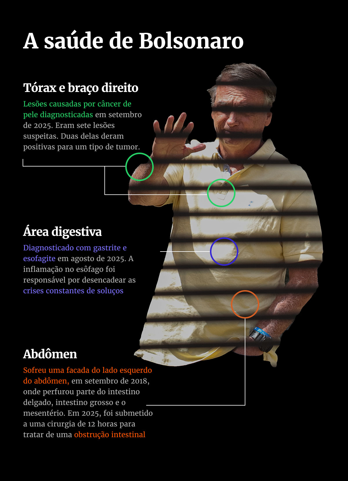 Além das restrições impostas pelo STF, aliados relatam que Bolsonaro enfrenta episódios recorrentes de soluço e vômito, em decorrência da facada que levou em 2018, o que tem exigido idas ao hospital e interferido no ritmo das conversas. Durante os 100 dias de confinamento, Bolsonaro foi três vezes ao hospital. Nesse período, também teve de acionar seu médico, Carlos Birolini, às pressas em casa, em 29 de setembro.