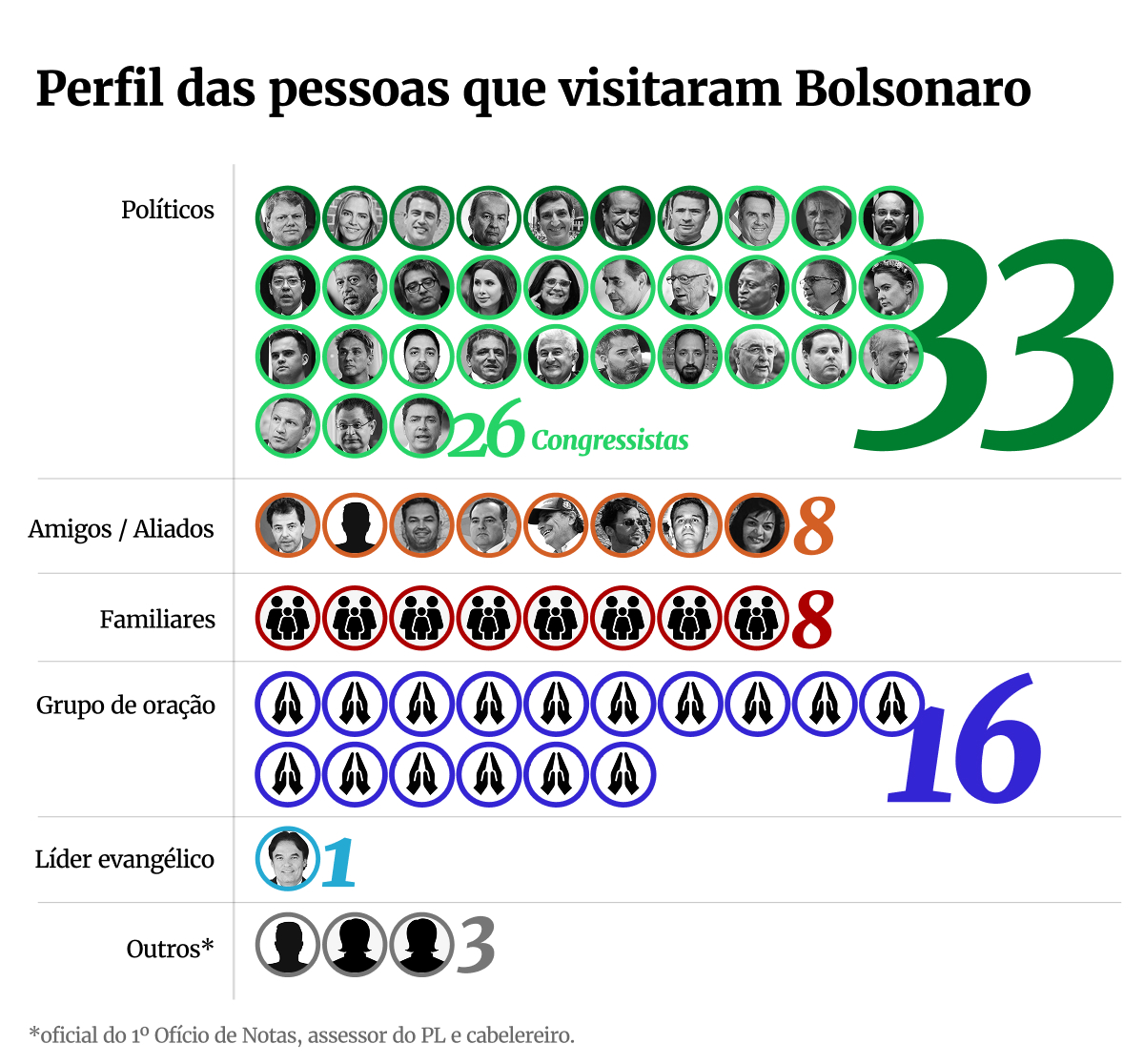 Entre 4 de agosto e 12 de novembro, Bolsonaro esteve com visitantes em 62 ocasiões, atendendo a 69 pessoas. O número de encontros é menor do que o de visitantes porque algumas reuniões foram coletivas.