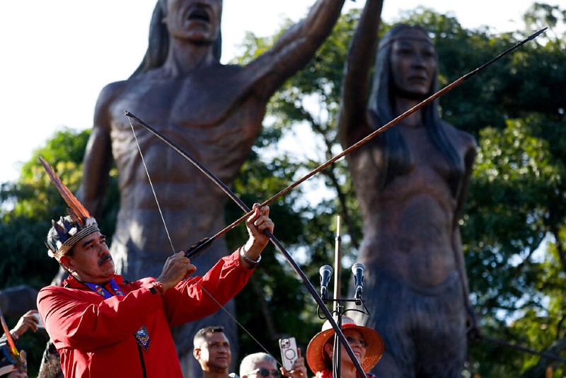O presidente da Venezuela, Nicolás Maduro, segura flechas enquanto participa de uma manifestação para marcar o Dia da Resistência Indígena, em Caracas — Foto: Leonardo Fernandez Viloria/Reuters