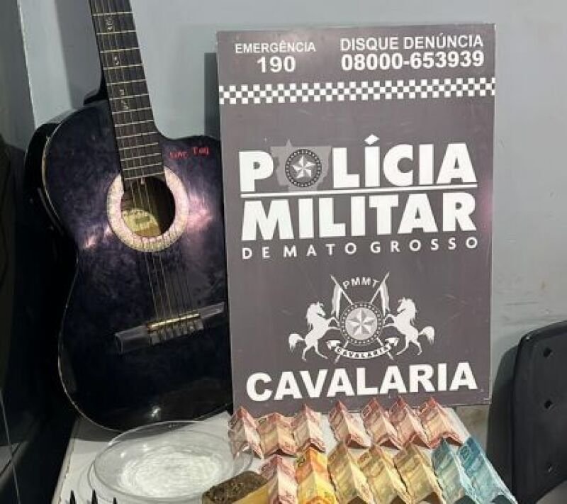 Durante buscas no interior do imóvel, foram apreendidos uma porção grande de maconha escondida dentro de um violão, 11 pinos com substância análoga à cocaína, duas porções de pasta base, uma porção adicional de cocaína, além de uma pequena porção de maconha.