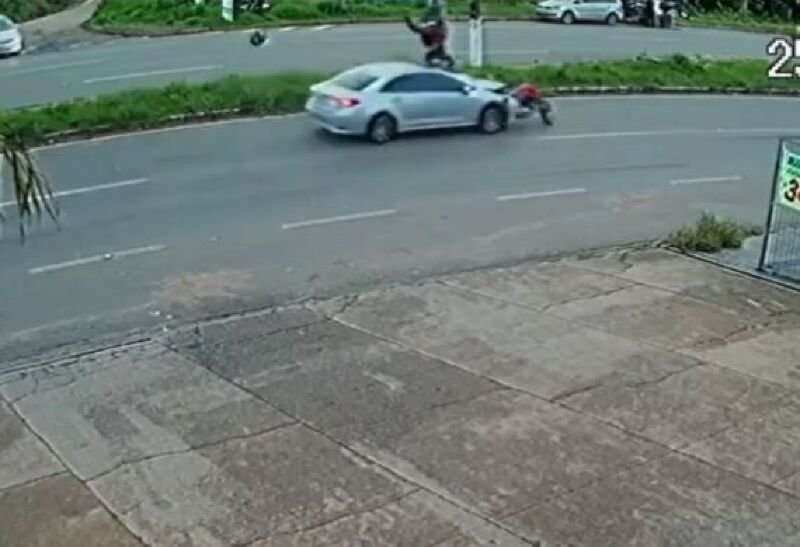 Um motociclista de aplicativo de 28 anos e o passageiro, de 20 anos, foram atropelados por um Toyota Corolla na Avenida Júlio Campos, em Várzea Grande. O caso ocorreu nessa quarta-feira (25) e foi registrado por uma câmera de segurança.