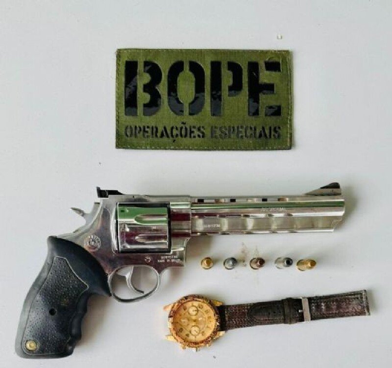 Com o suspeito, os policiais apreenderam um revólver calibre .38, carregado com munições intactas, além de um relógio. De acordo com a Polícia Militar, Danilo acumulava pelo menos 15 passagens criminais, incluindo tráfico de drogas, roubo, porte ilegal de arma, receptação, lesão corporal, corrupção de menores e associação criminosa, com registros desde 2018.