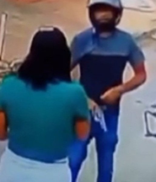 O criminoso, que usava camiseta cinza e calça jeans, estava em uma motocicleta. Nas imagens, ele aparece parando o veículo em frente a um carro, aguardando a aproximação da vítima.