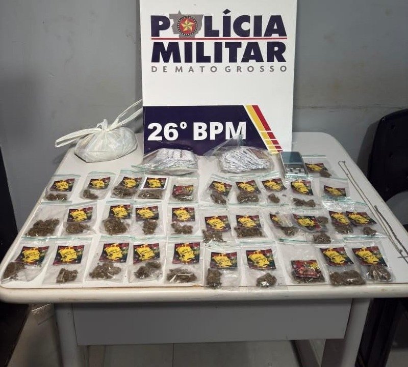 Já no bairro Bela Vista, outro suspeito foi detido após tentar fugir. Com ele, foram encontradas cinco porções de maconha. Dentro da residência, os policiais localizaram mais 28 porções da droga, embaladas e etiquetadas com símbolos ligados a uma facção criminosa. O homem confessou que o entorpecente seria destinado à cidade de Barra do Bugres.